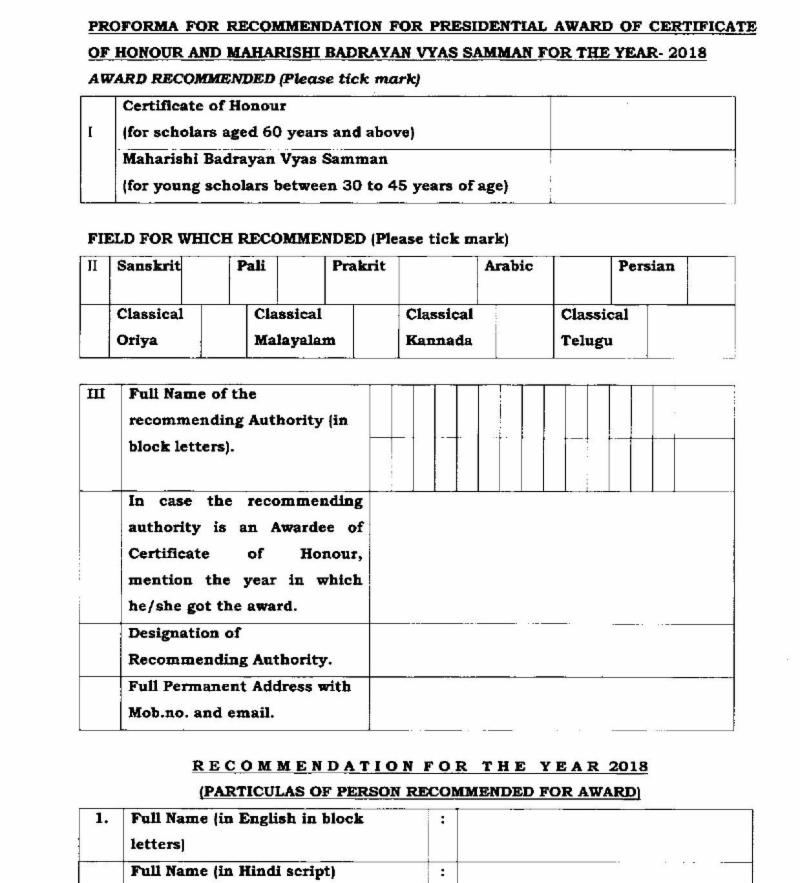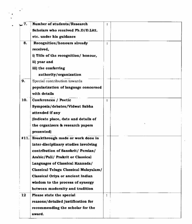 The eminent Scholars who have teaching experience, published works- number of books / articles published, research work and have kept the traditional Sanskrit, Classical Oriya, Classical Kannada, Classical Telugu and Classical Malayalam studies alive, should submit their nominations with appropriate information as applicable in the Proforma given below and sending it by 25th March 2018 by email to pic1.washington@mea.gov.in or by postal mail to Attaché (PIC), Embassy of India, 2107 Massachusetts Ave NW, Washington, DC 20008. Applications will be sent to Ministry of Human Resource Development (MHRD) for decision.